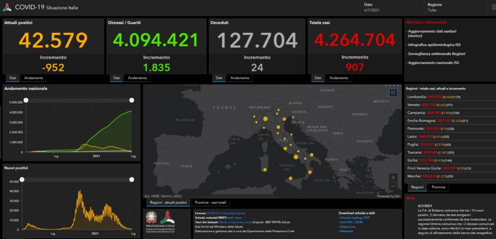 Sono 907 i nuovi contagi da Covid-19 in Italia a fronte di 192.424 tamponi. Il tasso di positività è allo 0.48%. Lo si apprende dall’ultimo bollettino diffuso dal ministero della Salute. I decessi sono 24 per un totale aggiornato da inizio pandemia a quota 127.704. Continuano a calare anche se più lievemente i numeri degli ospedali. Le persone in terapie intensive a oggi sono 187, 4 in meno di ieri mentre i ricoveri ordinari sono scesi a quota 1.271 (-66),