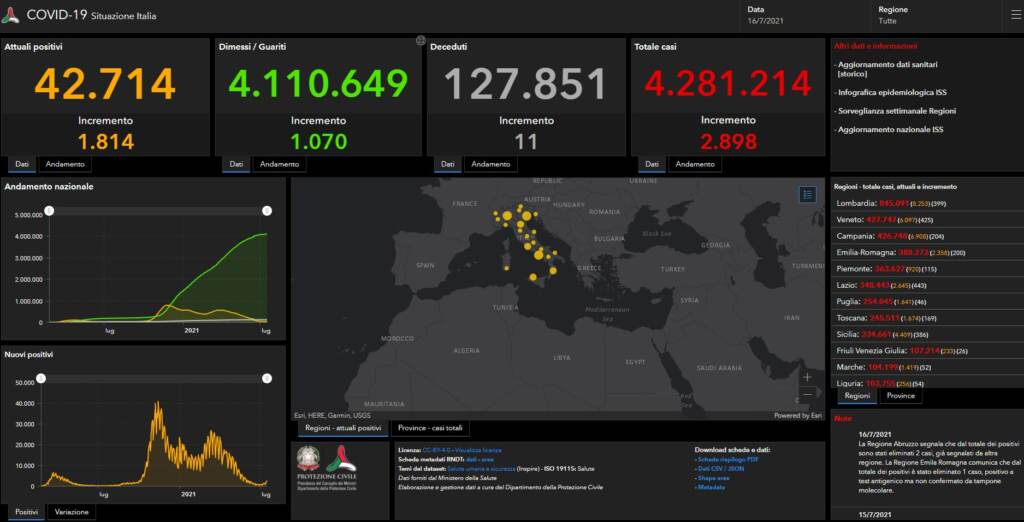 Sono 2.898 i nuovi casi di Covid registrati in Italia: il totale sale a 4.281.214. Sono 205.602 i tamponi processati. Il tasso di positività è quindi all’1,4% (ieri era 1,28%). Sono 127.85 le vittime di Covid nel nostro Paese, 11 nelle ultime 24 ore.