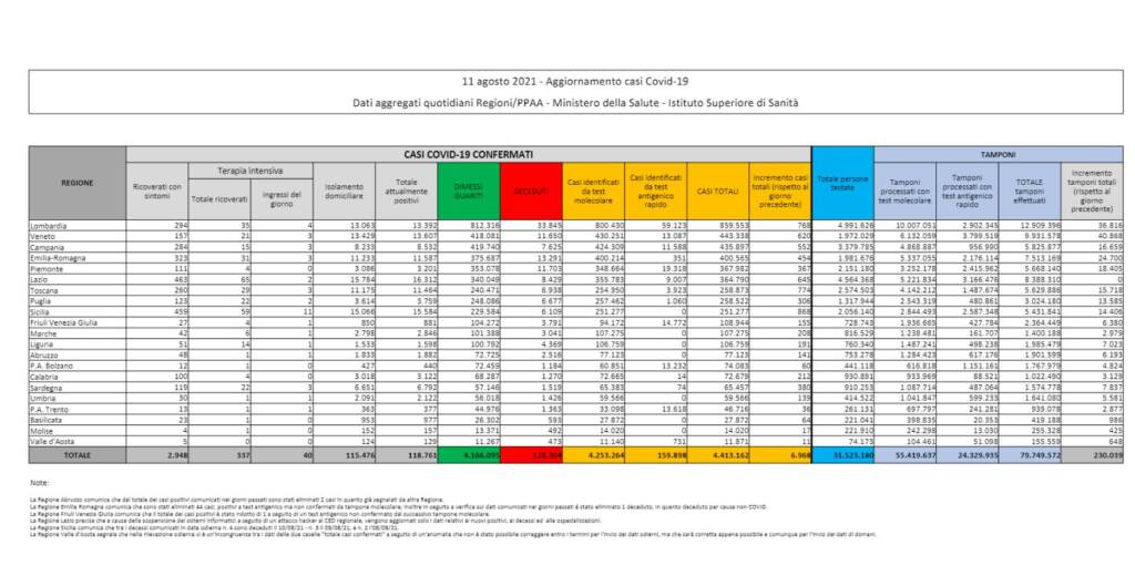 Da inizio pandemia i casi sono stati in totale 4.413.162. Le vittime sono 31, lo stesso numero di ieri: 128.304 da inizio pandemia.