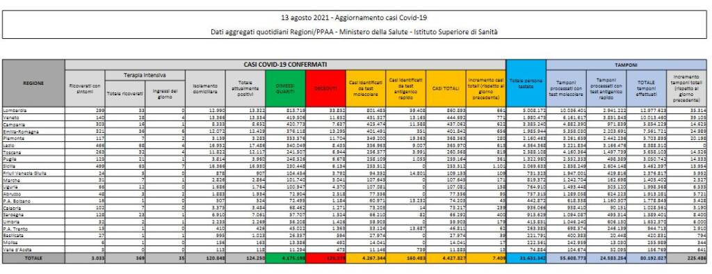 Bollettino Covid del 13 agosto, altri 7.409 nuovi contagi. Tasso positività al 3,3%