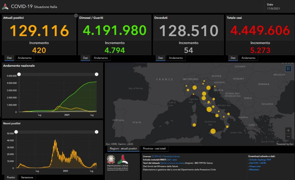 Le vittime sono 54, che portano il totale dei decessi da inizio pandemia a 128.510.