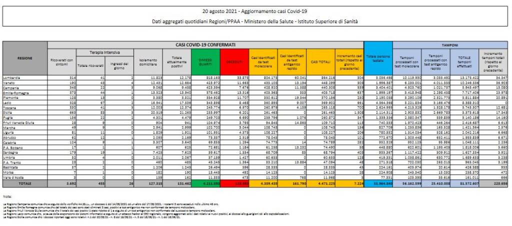 Sono 7.224 i nuovi contagi da Covid-19 in Italia a fronte di 220.656 tamponi. Il tasso di positività si attesta al 3,3% in lieve calo rispetto a ieri. I decessi sono 49. Lo evidenzia il bollettino del ministero della Salute del 20 agosto. Tornano a calare le terapie intensive: in totale oggi sono 455, 5 in meno rispetto a ieri, con 26 ingressi giornalieri, anche qui dato in calo (-14) rispetto a 24 ore fa. Continua invece la crescita dei ricoveri ordinari che hanno toccato quota 3.692 (+65 in 24 ore).
