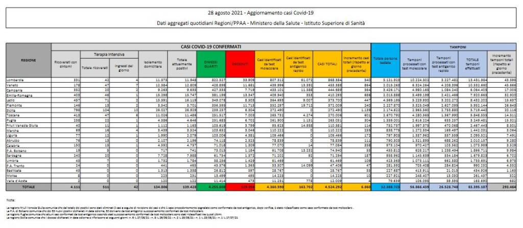 Sono 6.860 i nuovi contagi da Covid-19 in Italia a fronte di un boom di tamponi, 293.464 per un tasso di positività che scende al 2,3%. Lo si legge sul bollettino del 28 agosto pubblicato dal ministero della Salute. I decessi sono 54 mentre sono stabili i ricoveri negli ospedali. Le terapie intensive restano 511 come ieri mentre in area medica ci sono oggi 4.111 persone, tre in meno rispetto a 24 ore fa.