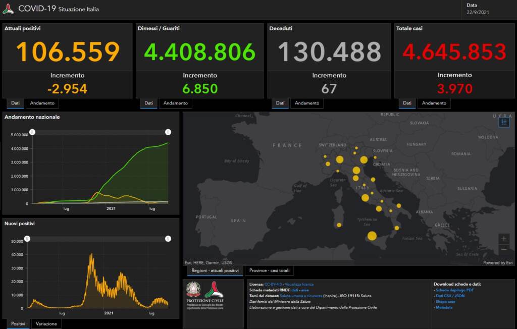 Covid, il bollettino del 22 settembre: 3.970 casi e 67 morti