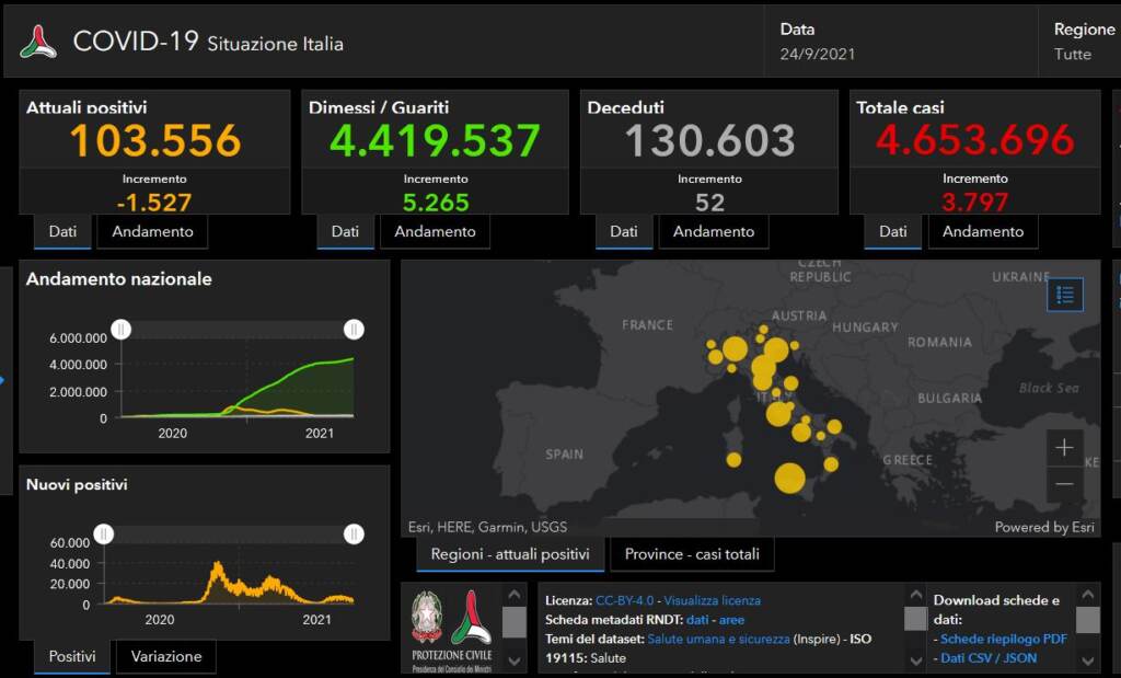 Sono 3.797 i nuovi casi di Covid-19 in Italia su 287.287 tamponi nelle ultime 24 ore in Italia. E’ quanto emerge dal bollettino diffuso dal ministero della Salute . Giovedì i nuovi contagi erano stati 4.061 con 321.554 test. 52 le vittime,p er un totale, da inizio pandemia di 130.603 morti.