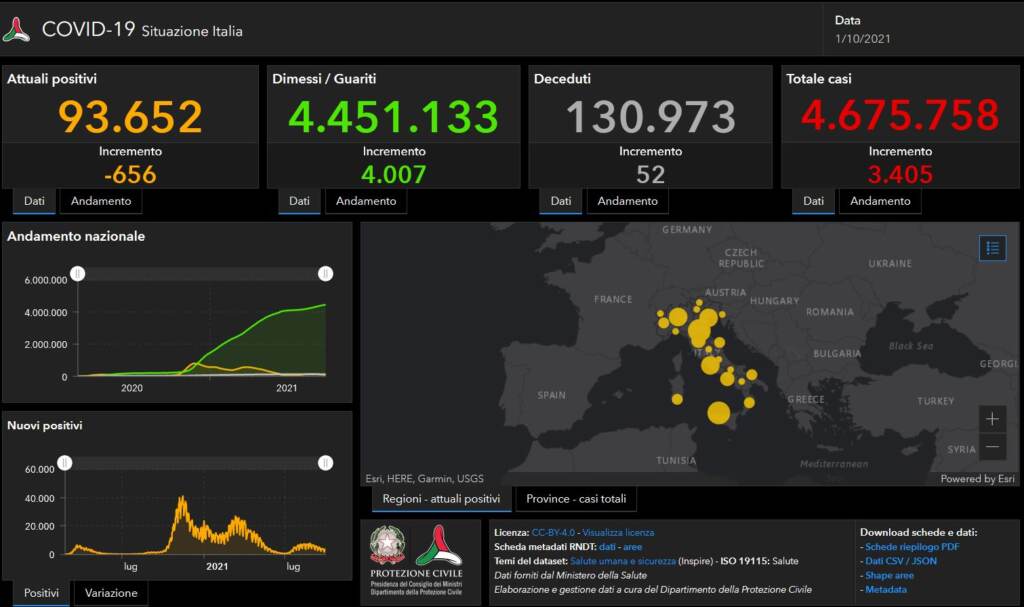 Covid, bollettino 1 ottobre: 3405 casi e 52 morti