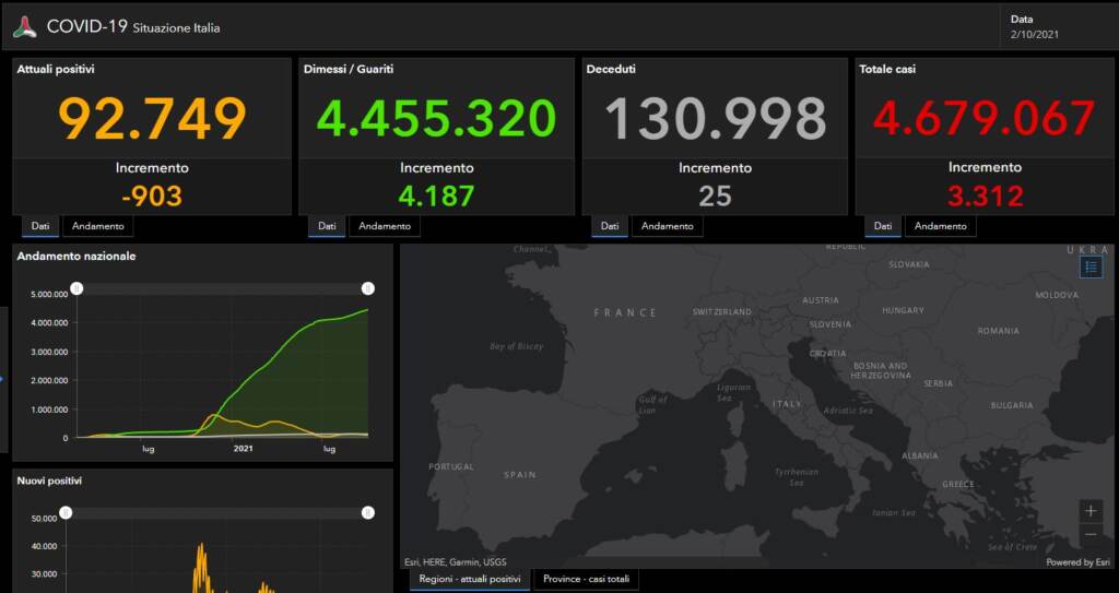 Sono 3.312 i nuovi casi di contagio registrati in Italia nelle ultime 24 ore e 25 i morti. È quanto emerge dai dati del ministero della Salute. In totale da inizio pandemia sono 4.679.067 i casi registrati, 130.998 le vittime 355.896 i test, tra antigenici e molecolari, processati nelle ultime 24 ore: i tasso di positività si attesta allo 0,9%, in calo dello 0,2% rispetto a ieri.