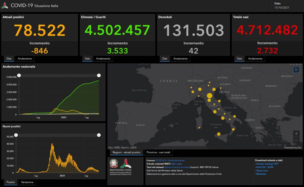 Sono 2.732 i nuovi contagi da Covid-19 in Italia a fronte di un numero record di tamponi, 506.043, favorito dal via all’obbligo del Green Pass sui posti di lavoro. Il tasso di positività scende allo 0,5%. Lo evidenzia il nuovo bollettino diffuso dal ministero della Salute. Sono 42 i decessi con un totale da inizio pandemia aggiornato a quota 131.503. In lieve calo le terapie intensive, -2 per un totale di 357. Dimuniscono anche i ricoveri ordinari: sono 2.445, -34 nelle ultime 24 ore.