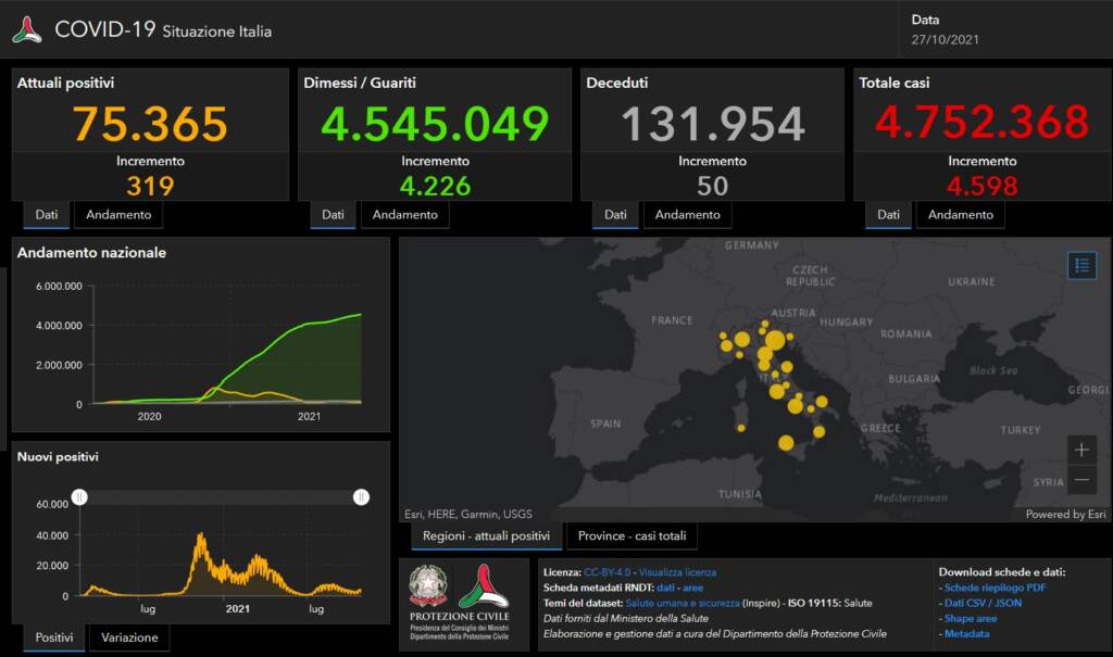 Sono 4.598 i nuovi casi di positività al covid registrati in Italia nelle ultime 24 ore, secondo il quotidiano bollettino del Ministero della Salute, su 468.104 i tamponi effettuati. Il tasso di positività è dell’1% (+0.3%). Le vittime del giorno sono 50, per un totale di 131.954 morti da inizio pandemia.