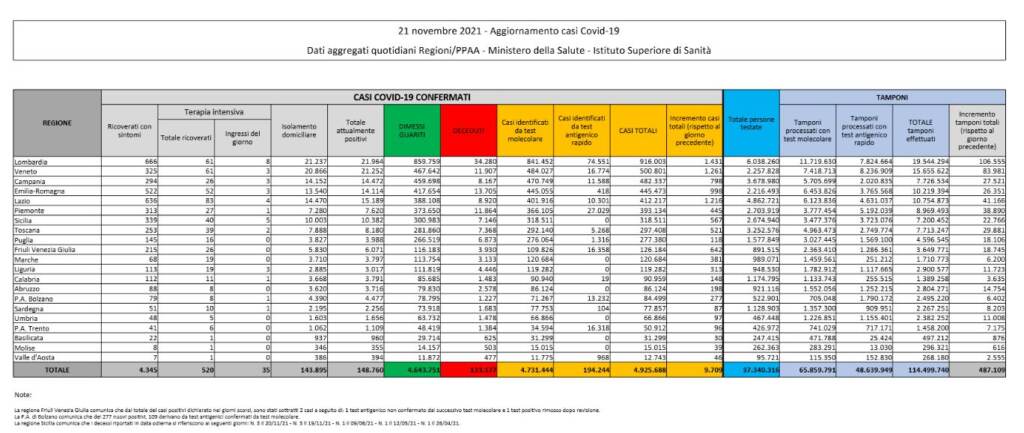 Bollettino Covid 21 novembre: 9.709 nuovi contagi, 46 i decessi