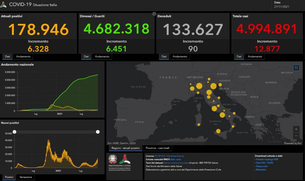 Sono 12.877 i nuovi contagi da Covid-19 in Italia a fronte di 596.898 tamponi con il tasso di positività che si attesta al 2,2%. Lo evidenzia l’ultimo bollettino del ministero della Salute. I morti sono 90 con un totale aggiornato da inizio pandemia che sale a un totale di 133.627. Crescono di 18 unità le terapie intensive con il totale aggiornato a quota 624. In aumento di 78 unità invece i ricoveri ordinari. Gli attualmente positivi in Italia sono 178.946 in crescita di 6.328 unità.