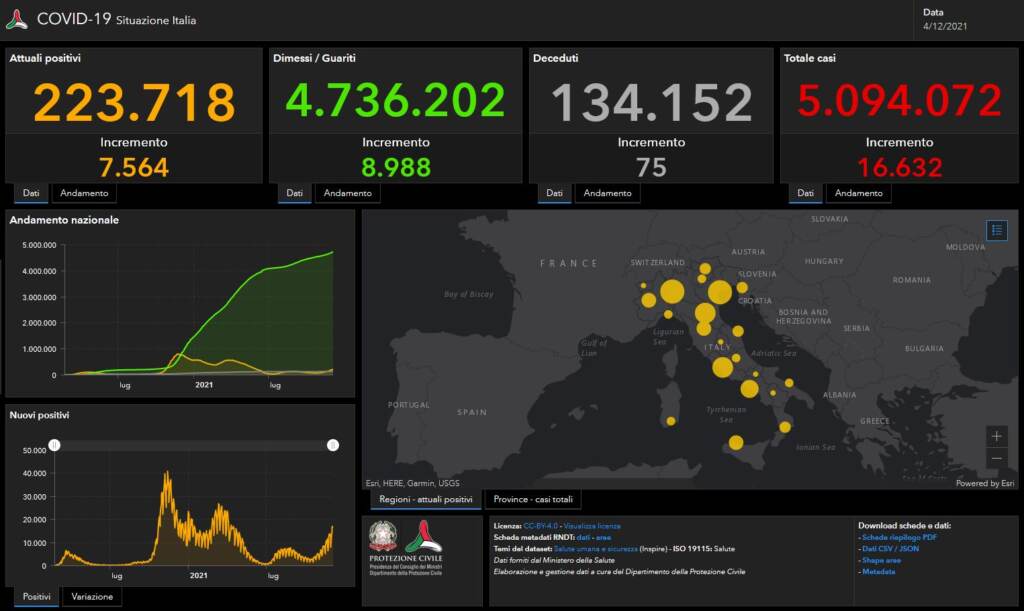 Il bollettino Covid del 4 dicembre: 16.632 casi e 75 vittime in 24 ore