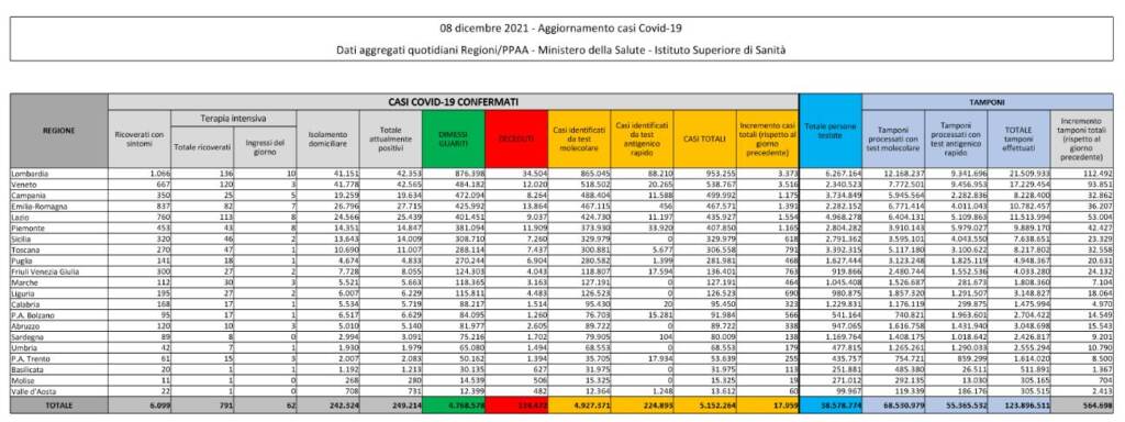 Sono 17.959 i nuovi casi di Covid in Italia. Lo attesta il Bollettino quotidiano del Ministero della Sanità. I tamponi processati – tra molecolari e antigenici – sono 564.698.
