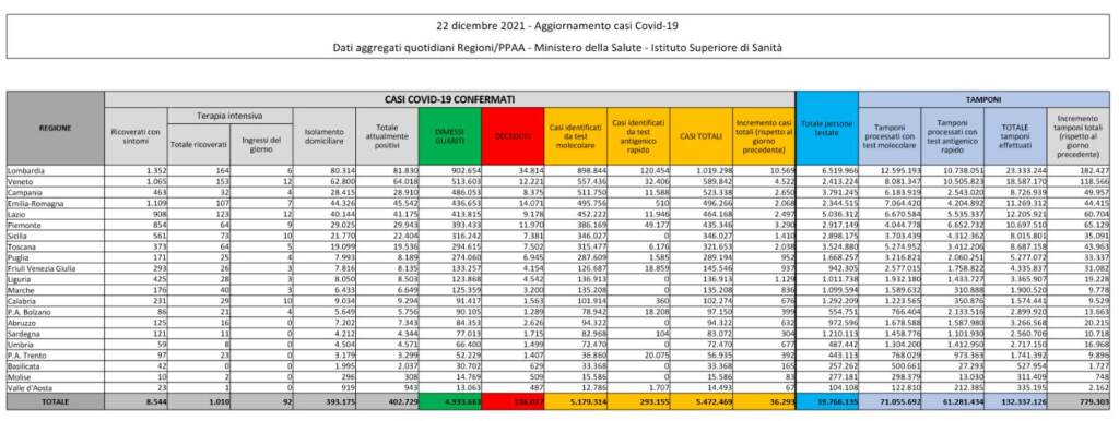 Sono 36.293 i nuovi casi di Covid in Italia, a fronte di 779.303 tamponi processati. È quanto emerge dal Bollettino quotidiano del Ministero della Salute.