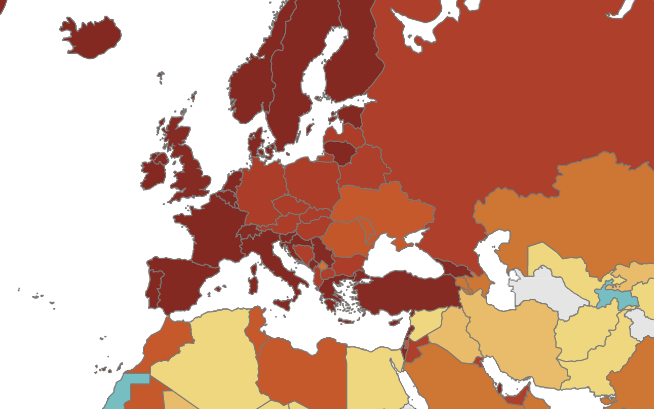 Nella mappa settimanale del Centro europeo per la prevenzione e il controllo delle malattie (Ecdc) tutta l’Europa è in rosso scuro, il massimo grado di classificazione, tranne Polonia, Romania ed Est dell’Ungheria che sono in rosso.