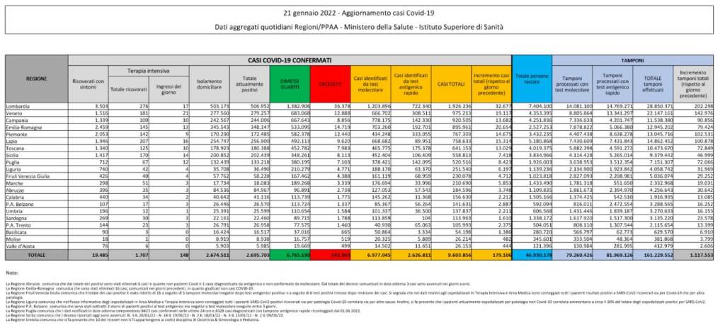 In lieve crescita ancora le terapie intensive che raggiungono in totale le 1.707 unità, +9 in 24 ore. In calo invece i ricoveri ordinari che nelle ultime 24 ore fanno segnare un -174. Le persone attualmente positive in Italia sono 2.674.511.