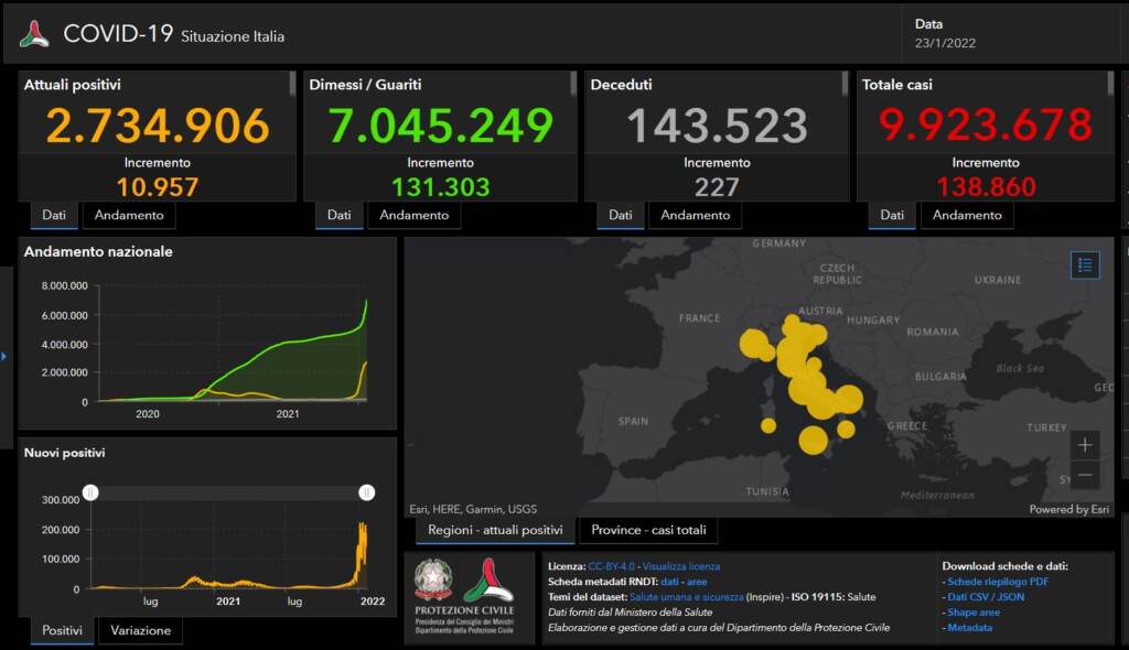 Sono 138.860 i nuovi contagi da Covid-19 nelle ultime 24 ore in Italia, secondo i dati del quotidiano bollettino del Ministero della Salute. 227 i decessi segnalati. Casi e morti erano stati, sabato, 171.263 e 333 rispettivamente.