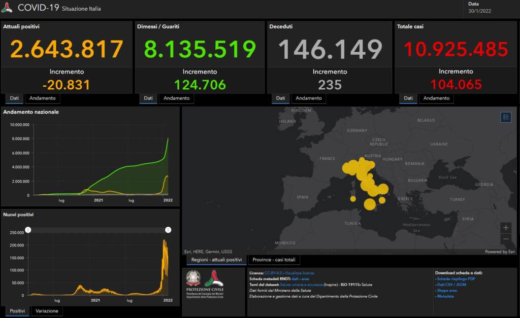 Bollettino Covid 30 gennaio, continua la discesa dei contagi: 104.065 in 24 ore, 235 i decessi