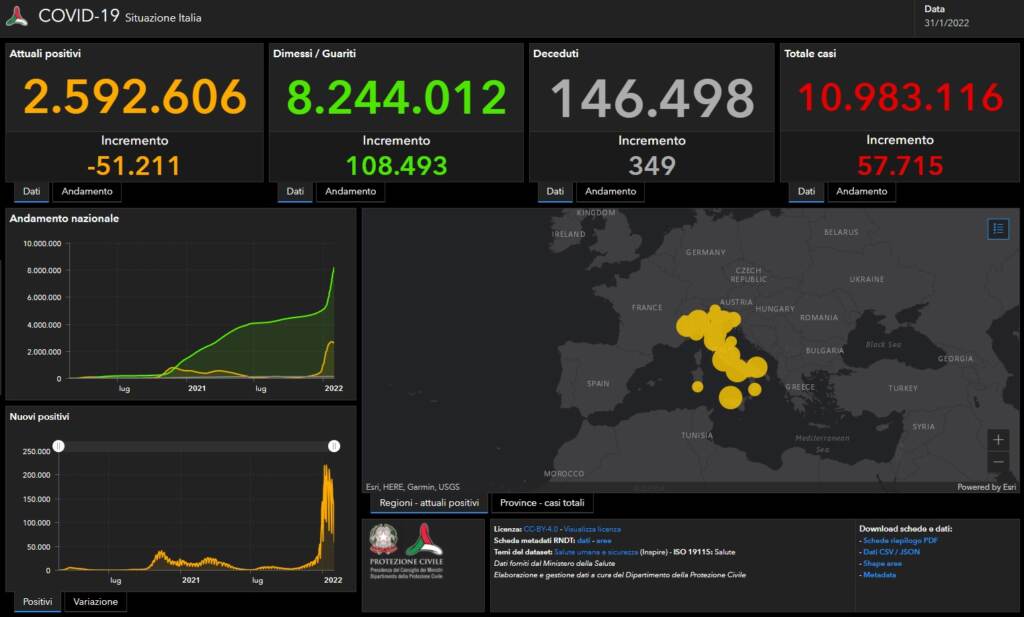 Sono 57.715 i nuovi casi di Covid in Italia nelle ultime 24 ore mentre i decessi nell’ultimo giorno sono 349. I tamponi processati sono invece 478.314, numero che porta il tasso di positività in discesa al 12,1%. Per quanto riguarda la situazione ospedaliera, i dati del ministero della Salute certificano un calo delle terapie intensive che nel saldo tra ingressi e uscite diminuiscono di nove unità. In aumento invece i ricoveri ordinari: 296 in più nelle ultime 24 ore. Ieri i casi erano 104.065 e 235 i decessi.