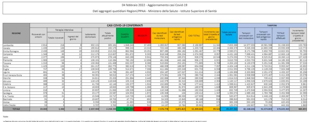 Sono oltre 99mila i nuovi casi covid registrati in Italia nelle ultime 24 ore, su 884.893 tamponi processati, secondo il bollettino del ministero della Salute. Il tasso di positività all’11,2%. Le vittime del giorno sono 433, che portano il totale dei decessi a 148.167 morti. I guariti nelle ultime ore sono 210.353.