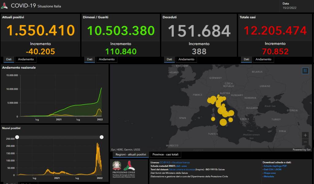 Continua il calo della curva epidemica in Italia con l’ultimo bollettino del ministero della Salute che certifica 70.852 nuovi casi e 388 decessi. Nelle ultime 24 ore sono 695.744 i tamponi processati per un tasso di positività stabile al 10,2%. Diminuiscono ancora anche i pazienti ospedalizzati: sono 448 in meno quelli ricoverati nei reparti ordinari mentre diminuiscono di 54 unità quelli nelle terapie intensive.