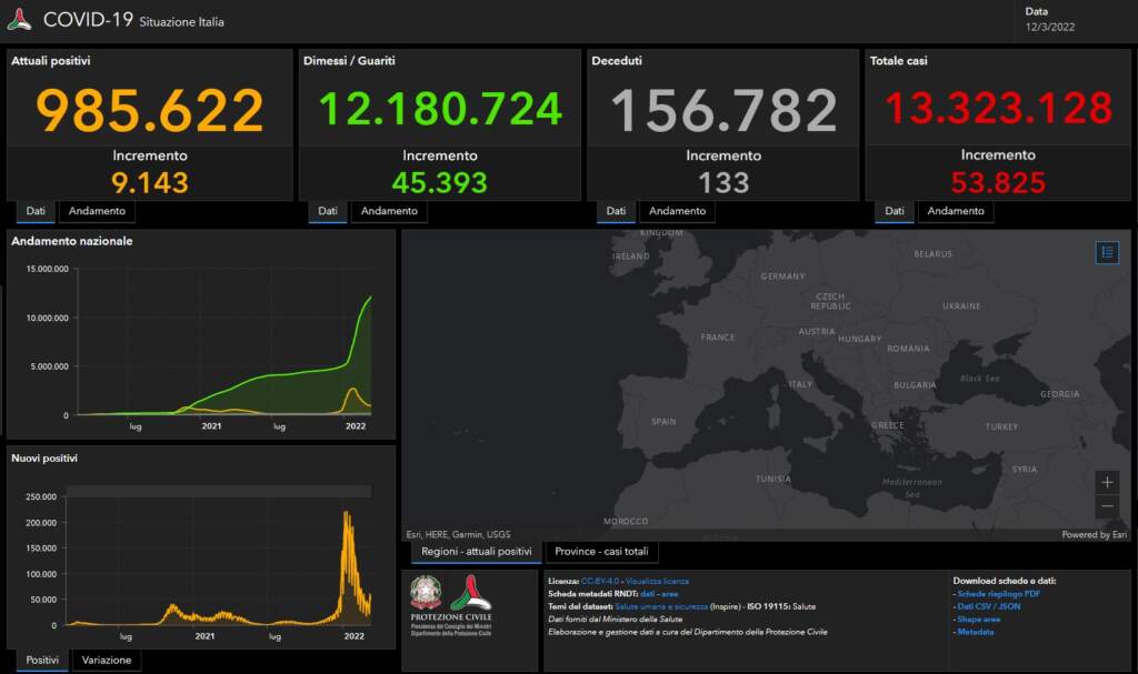 Sono 53.825 i nuovi casi di Covid-19 registrati nelle ultime 24 ore in Italia per un totale di 13.323.128 e 133 i pazienti morti, che portano il totale delle vittime italiane del virus a 156.782 all’inizio della pandemia. É quanto emerge dal bollettino diffuso dal ministero della Salute. Nelle ultime 24 ore in Italia sono stati eseguiti ben 417.777 tamponi, per un totale di 192.230.588 dall’inizio della pandemia. Grazie a questi test sono stati individuati 53.825 nuovi casi, con il tasso di positività che sia attesta al 12,9%.