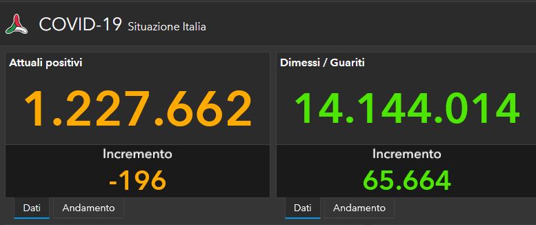 Leggero aumento dei casi di Covid in Italia, dove nelle ultime 24 ore si sono registrati 64.951 nuovi contagi su 438.375 i tamponi contro i 62.037 di mercoledì. Secondo il bollettino ministeriale, il totale dei contagi da inizio pandemia sale a 15.533.012. In leggero calo il numero dei decessi con 149 vittime contro le 155: il totale dei morti da inizio pandemia sale a 161.336. Il tasso di positività è stabile al 14,8%. Calano di 29 unità i ricoveri in terapia intensiva, mentre sono 91 in meno i pazienti ricoverati negli altri reparti Covid.
