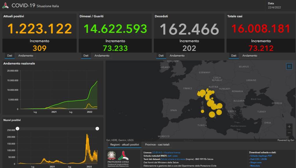 Covid, il bollettino del 22 aprile: 73mila nuovi casi in Italia, 202 i decessi