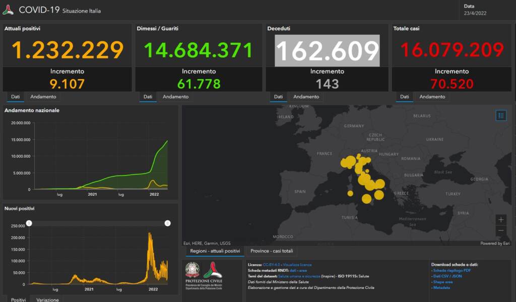 Il bollettino Covid del 23 aprile: 70.520 casi e 143 vittime