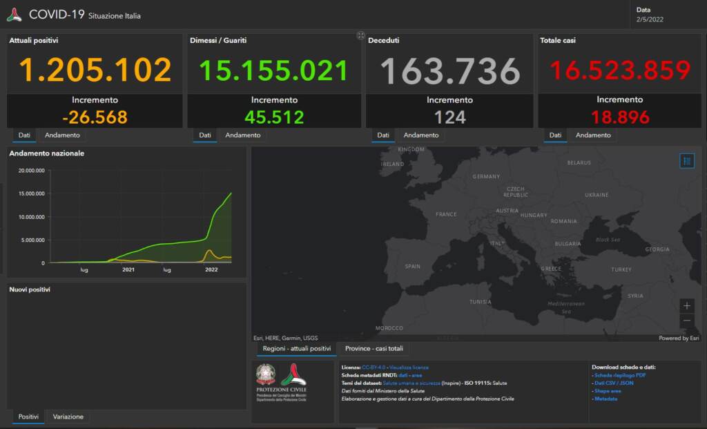 Sono 18.896 i nuovi casi Covid registrati in Italia nelle ultime 24 ore, su 122.444 tamponi processati: il tasso di positività al 15,4%, in aumento dell’1,3% rispetto al dato precedente. Le vittime del giorno sono 124, che portano il totale dei decessi a 163.736 da inizio pandemia.