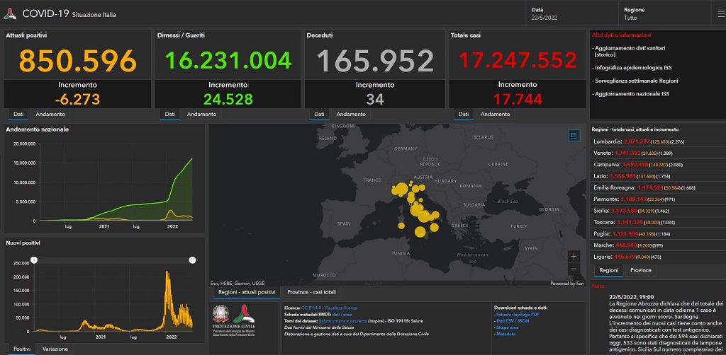 Sono 17.744 i nuovi casi di Covid-19 registrati nelle ultima 24 ore in Italia per un totale di 16.231.004 dall’inizio della pandemia. É quanto si legge nel bollettino del ministero della Salute. I pazienti morti nelle ultime 24 ore sono 34 e portano il totale dei decessi a 165.952.