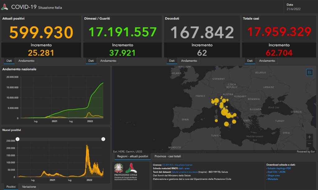 Impennata di casi Covid in Italia dove si registrano nelle ultime 24 ore 62.704 contagi (contro i 16.571 del giorno prima). I tamponi processati sono 292.345, con un tasso di positività ancora in crescita al 21.4%. Cresce, anche se di poco, il dato delle vittime Covid in Italia nelle ultime 24 ore con 62 decessi contro i 59 registrati ieri dal bollettino del ministero della Salute. I morti da inizio pandemia salgono a 167.842