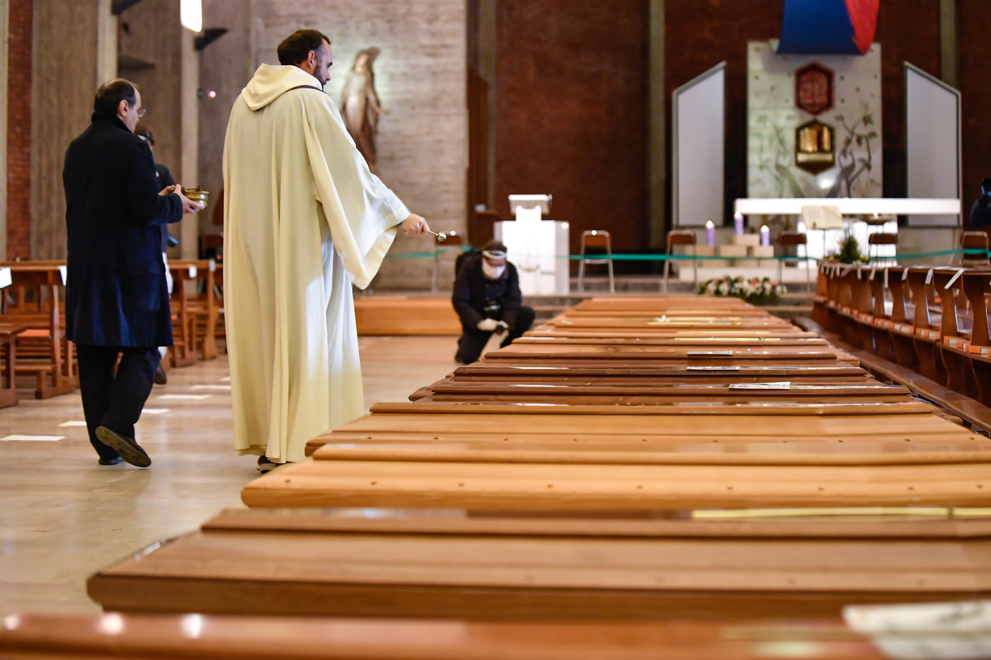 Coronavirus, il prete benedice le salme nella chiesa di Seriate
