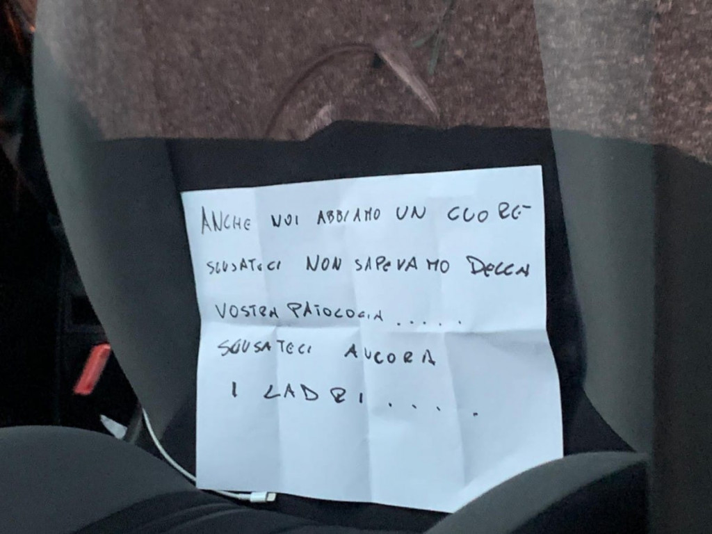 Dopo poco tempo l’auto è stata ritrovata e dentro era presente un cartello: “Anche noi abbiamo un cuore, scusateci, non sapevamo della vostra patologia. Scusateci ancora”, firmato ‘i ladri’.