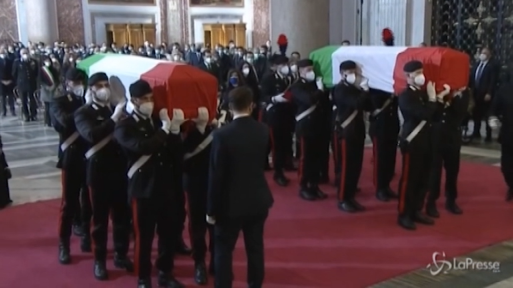 (LaPresse) Nella basilica romana di Santa Maria degli Angeli i funerali di Stato di Luca Attanasio e Vittorio Iacovacci. L’ingresso in chiesa delle salme dell’ambasciatore italiano e del carabiniere uccisi nella Repubblica Democratica del Congo.