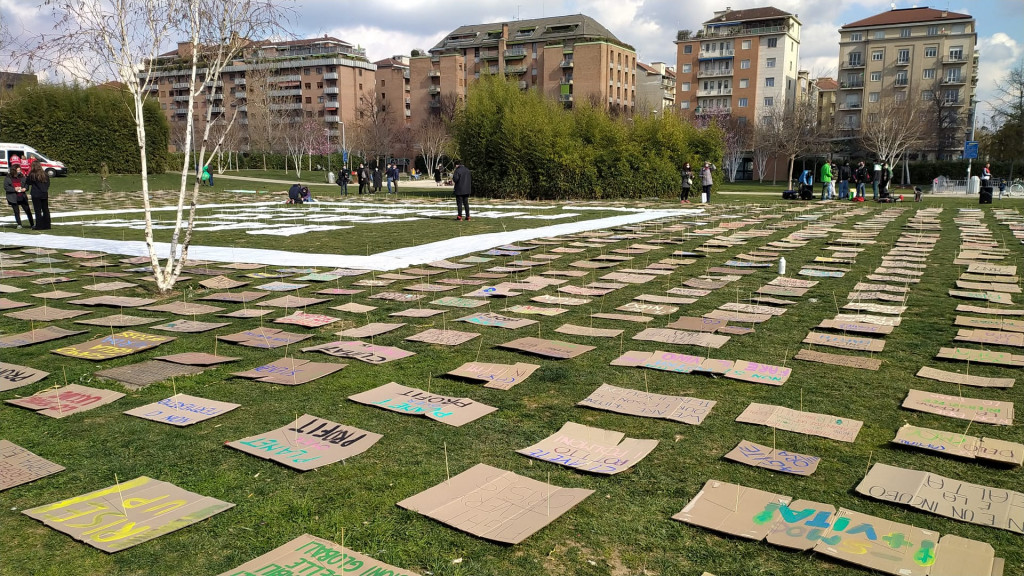 I Fridays for Future tornano in piazza, dopo mesi di stop alle manifestazioni in presenza, per un nuovo sciopero per il clima. A Torino migliaia di cartelloni sono comparsi nei giardini di fronte al Palazzo di Giustizia e al grattacielo San Paolo. “Basta parole vuote” e “Basta false promesse” gli slogan più gettonati.