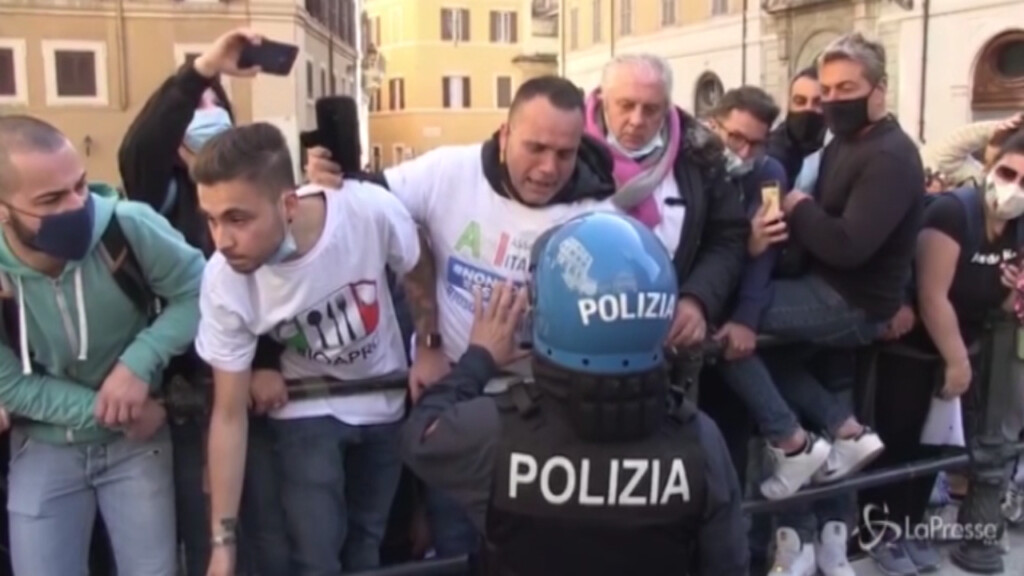 (LaPresse) Momenti di tensione a Roma davanti a Montecitorio per la protesta dei ristoratori. Sono stati lanciati alcuni oggetti. I manifestanti, molti senza mascherina, sono stati trattenuti dai poliziotti in tenuta anti-sommossa. Ma la disperazione dei manifestanti ha fatto breccia tra gli agenti: uno di loro si è avvicinato a una transenna, dove un uomo urlava e piangeva, cercando di portare conforto e mostrando comprensione per la situazione.