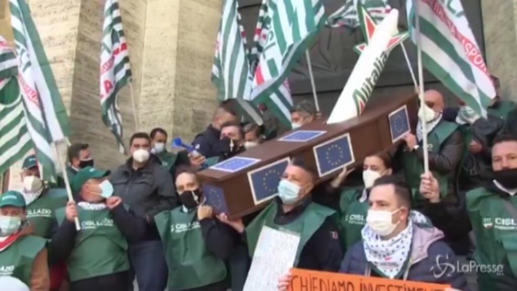 (LaPresse) Protesta dei dipendenti di Alitalia davanti alla sede del Ministero dello Sviluppo Economico, a Roma. Le risorse sono finite, si rischia seriamente l’operatività. I lavoratori lamentano la mancanza di un progetto strutturale per il salvataggio e il rilancio della compagnia di bandiera. “Alla Comunità europea stanno cercando di favorire Lufthansa e Air France e fare il funerale alla nostra compagnia, che da più di settant’anni porta passeggeri in giro per il mondo e vorrebbe continuare a portarli”, protestano i dipendenti di Alitalia. “Non abbiamo aspettative. Hanno messo un governo tecnico per fare qualcosa di capace, per fare sviluppo. Sta dimostrando tutto, tranne che lo sviluppo, perché una compagnia aerea fondamentale per il Paese che si depaupera a favore di Air France e Lufthansa è una cosa incredibile. È inverosimile”.