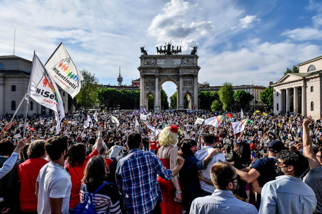 Una piazza gremita, colorata da centinaia di bandiere arcobaleno, all’Arco della Pace a Milano dove in 8mila – secondo gli organizzatori – hanno partecipato alla manifestazione ‘Il tempo è scaduto’, lanciata da I Sentinelli di Milano, per chiedere l’approvazione del ddl Zan.