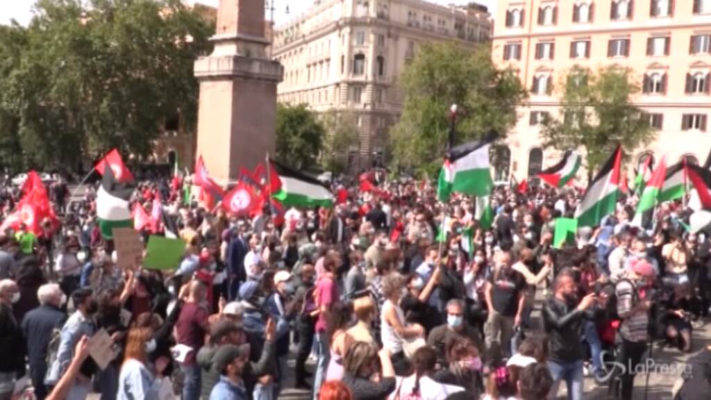 (LaPresse) – Piazza dell’Esquilino piena per la “giornata dell’orgoglio palestinese” in solidarietà alla popolazione di Gaza, in occasione della Nakba e per i bombardamenti israeliani nell’ambito del conflitto riesploso da una settimana tra Hamas e lo Stato ebraico. Dopo la veglia per Israele promossa al Portico d’Ottavia dalla comunità ebraica di Roma, con la partecipazione di molti politici di vari schieramenti, la comunità palestinese ha voluto rispondere a quella che viene definita dagli organizzatori “alla narrazione dei media italiani che individua negli ebrei di Israele le vittime del terrorismo di Hamas”. “Israele sta colpendo i bambini palestinesi”, dice una manifestante.