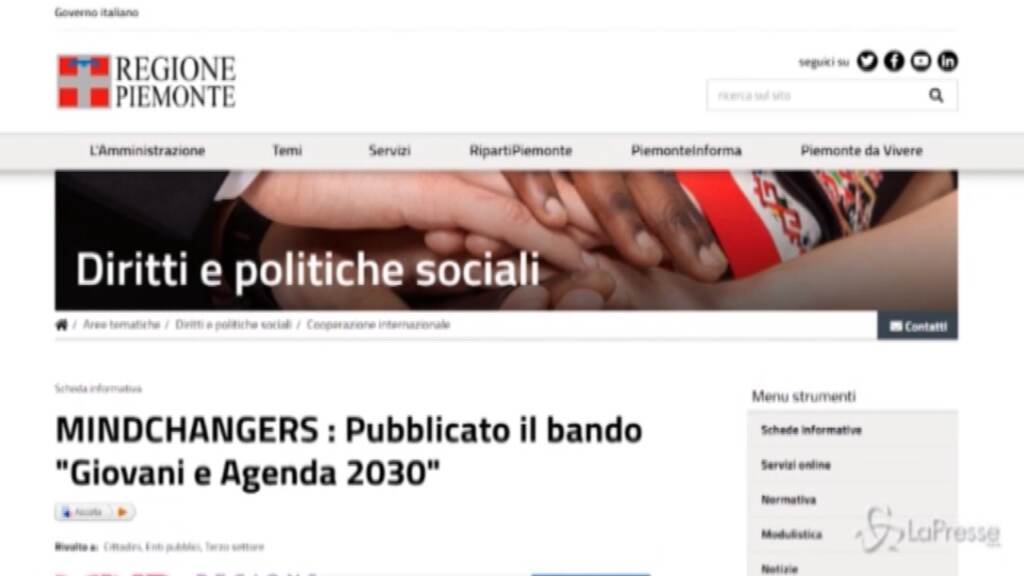 (LaPresse) Il Bando Giovani e Agenda 2030, nell’ambito del progetto europeo ‘Mindchangers: Regions and youth for Planet and People’, di cui la Regione Piemonte è capofila, intende rafforzare le strategie delle autorità locali e delle organizzazioni della società civile per raggiungere e coinvolgere i giovani sui temi dello sviluppo sostenibile e della cooperazione internazionale, ed in particolare sulle aree di interesse del cambiamento climatico e della migrazione. A presentarlo in videoconferenza stampa l’assessore regionale alla Cooperazione internazionale Maurizio Marrone. Il Bando ha una dotazione di 450mila euro ed è articolato in due lotti, ognuno da 225mila euro. Il promo lotto è rivolto alle azioni condotte da organizzazioni della società civile, il secondo a quelle portate avanti dalle autorità locali. La scadenza per la presentazione dei progetti è lunedì 19 luglio.