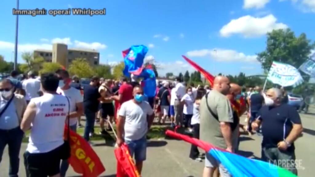 Protesta pacifica degli operai della Whirlpool di Napoli davanti al carcere di Santa Maria Capua Vetere nel giorno della visita al penitenziario del premier, Mario Draghi, e della Guardasigilli Marta Cartabia. L’azienda, proprio oggi, ha comunicato il via al licenziamento collettivo per i 340 operai dello stabilimento di Napoli. I dipendenti chiedono un confronto con il presidente del Consiglio, affinché il governo possa scongiurare il piano avviato dalla Whirlpool.