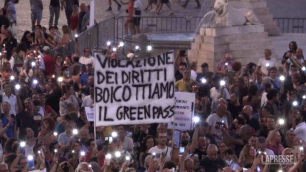 Poche centinaia di persone hanno risposto all’appello del senatore Armando Siri e del candidato sindaco Vittorio Sgarbi per protestare a Piazza del Popolo, a Roma, contro l’introduzione del Green Pass. La fiaccolata, poi diventata solo un presidio perchè la questura ha sequestrato le fiaccole, è poi diventata qualcos’altro. Al grido di “De Donno omicidio di Stato”, la gente si è riversata nelle strade scatenando il caos e provocando momenti di tensione con la polizia quando i manifestanti hannno bloccato via Flaminia, paralizzando il traffico.
