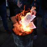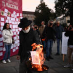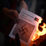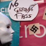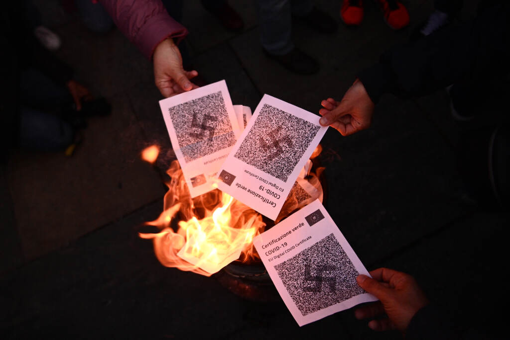 (LaPresse) Flash mob del popolo dei no Green Pass in piazza Castello a Torino per protestare contro la certificazione verde nel giorno del via all’obbligo sui posti di lavoro pubblici e privati. I manifestanti hanno simbolicamente bruciato in un falo i green pass tra gli applausi dei presenti. Sull’istallazione della Regione Piemonte, che segnala l’andamento della campagna vaccinale, sono stati incollati dei biglietti con i nomi delle persone che secondo i dimostranti sono morte per il vaccino.