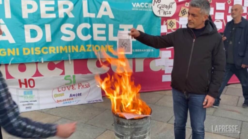 (LaPresse) A Torino il popolo dei no Green Pass si è radunato in piazza Castello per protesta nel giorno dell’avvio dell’obbligo della certificazione verde sui posti di lavoro pubblici e privati. I manifestanti hanno simbolicamente bruciato in un falo i green pass tra gli applausi dei presenti. Sull’istallazione della Regione Piemonte, che segnala l’andamento della campagna vaccinale, sono stati incollati dei biglietti con i nomi delle persone che secondo i dimostranti sono morte per il vaccino.