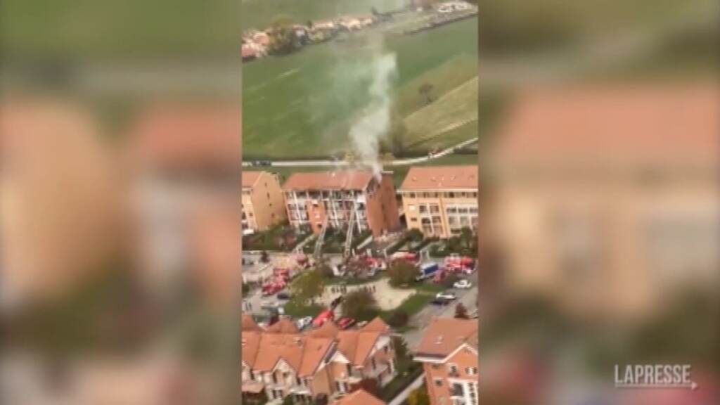 (LaPresse) Il fumo dell’incendio della palazzina parzialmente crollata a Pinerolo, in seguito a uno scoppio, si vede anche a grande distanza. La tragedia nel torinese, dove una donna di 84 anni è morta carbonizzata e il marito è ricoverato con gravi ustioni su tutto il corpo. Altri feriti lievi. Sul posto carabinieri, vigili del fuoco e 118. DISTRIBUTION FREE OF CHARGE – NOT FOR SALE