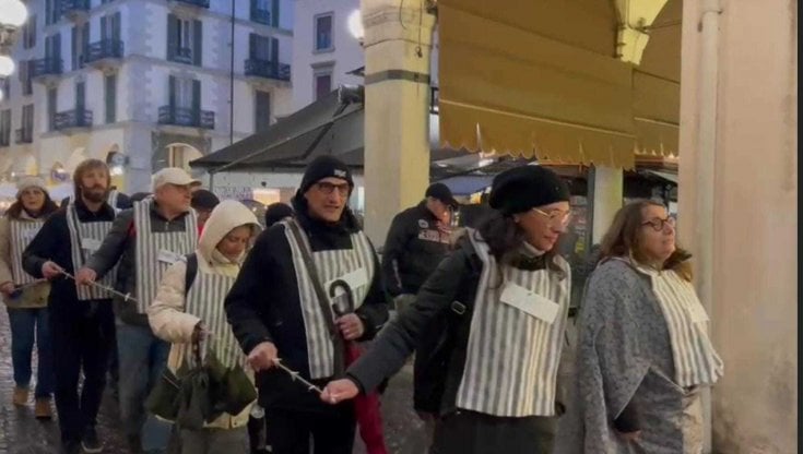 Hanno indossato pettorine a strisce verticali bianche e grigie, alcune addirittura con un numero identificativo appuntato addosso. E poi, tenendosi a una corda che ricordava un filo spinato, hanno sfilato per il centro storico di Novara contro il Green pass. In tutto qualche decina i manifestanti che sabato hanno scelto di protestare in questo modo, facendo un chiaro riferimento ai campi di concentramento, ai lager nazisti, per evocare la “dittatura” di cui – affermano – si sentono vittime per via dell’imposizione del certificato verde da parte del governo.