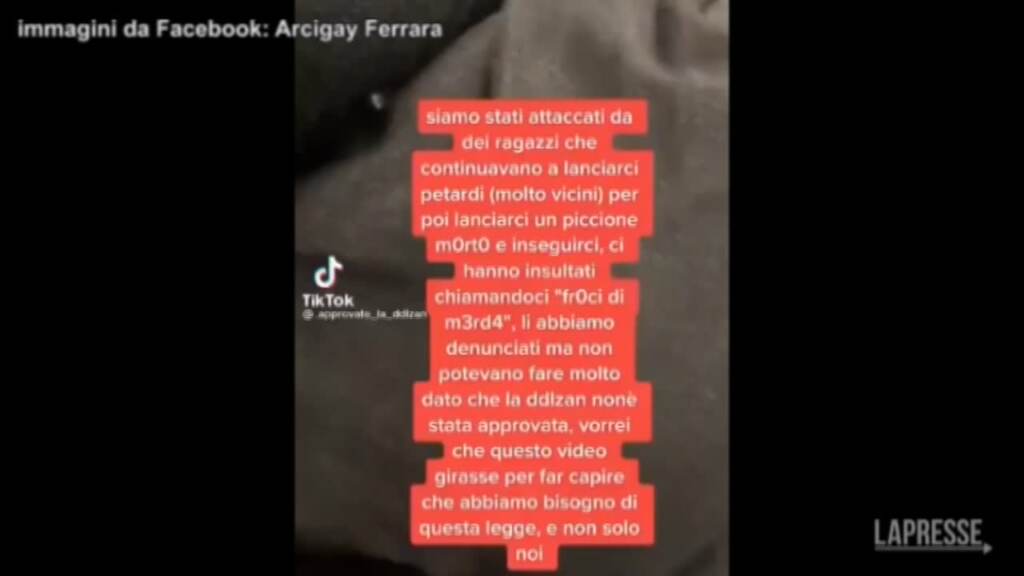 (LaPresse) Un gruppo di ragazzini tra i 12 e 16 anni è stato aggredito, a Ferrara, domenica pomeriggio, da altri giovani che li avevano presi di mira e che inneggiavano a Benito Mussolini. Il fatto è stato ripreso in un video, diffuso poi in rete anche da Arcigay Ferrara e probabilmente girato da uno degli aggrediti. Nella sequenza si sente uno dei presunti aggressori dire: “Conoscete Benito Mussolini? Sapete che lui vi brucerebbe tutti? Forza Benito Mussolini!”. L’Arcigay Ferrara, che sta approfondendo la dinamica dell’episodio, è venuta a conoscenza del fatto, tramite un messaggio, su Instagram, da parte dei giovanissimi aggrediti. Secondo quanto riportato dall’associazione, i genitori si starebbero muovendo per fare un esposto alla Digos. DISTRIBUTION FREE OF CHARGE – NOT FOR SALE