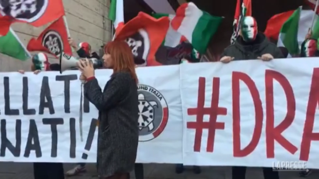 (LaPresse) Una cinquantina di militanti di Casapound ha manifestato davanti alla Stazione Termini di Roma contro il Green pass. La stazione presidiata da blindati e agenti in assetto anti sommossa. “Confini cancellati, italiani confinati. Draghi vattene”, si legge su uno striscione.