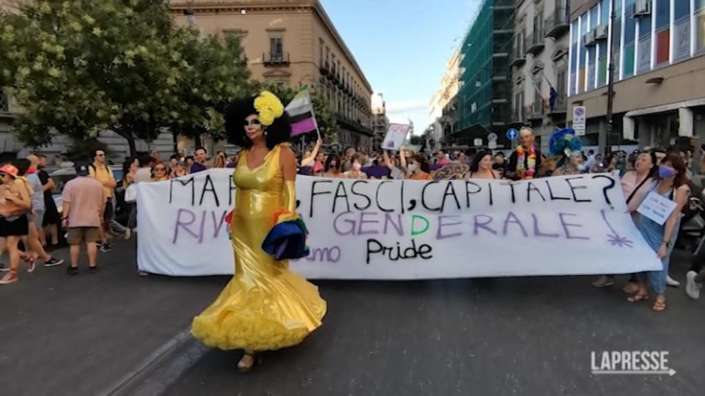 Migliaia di persone hanno sfilato al Palermo Pride, la manifestazione indetta per la difesa dei diritti della comunità LGBTQ+. Secondo gli organizzatori, al corteo hanno sfilato oltre 60mila persone. In testa lo striscione ‘Mafia, fasci e capitale? Rivolta genderale’. ‘Madrino’ della manifestazione Beppe Fiorello.